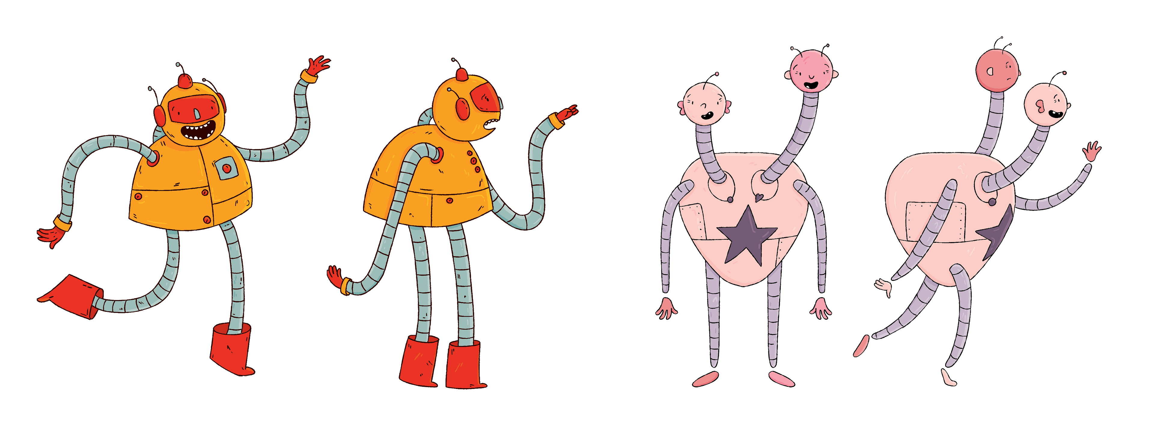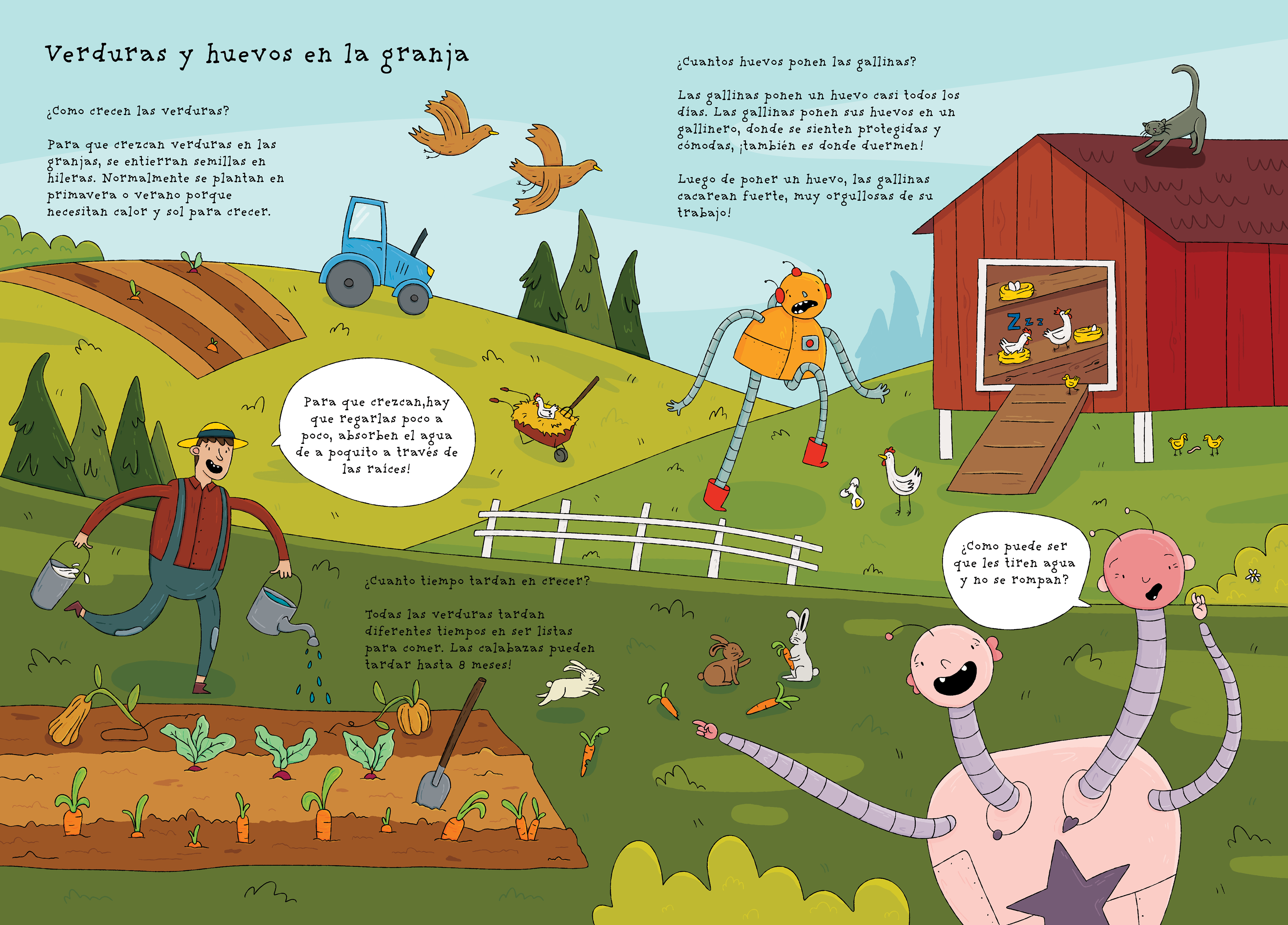 In the first book, the robots visit a farm, where they learn about it and the roles that humans and animals have."